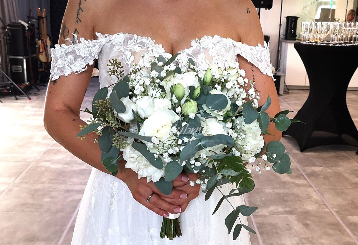 biały bukiet ślubny z dodatkiem eukaliptusa