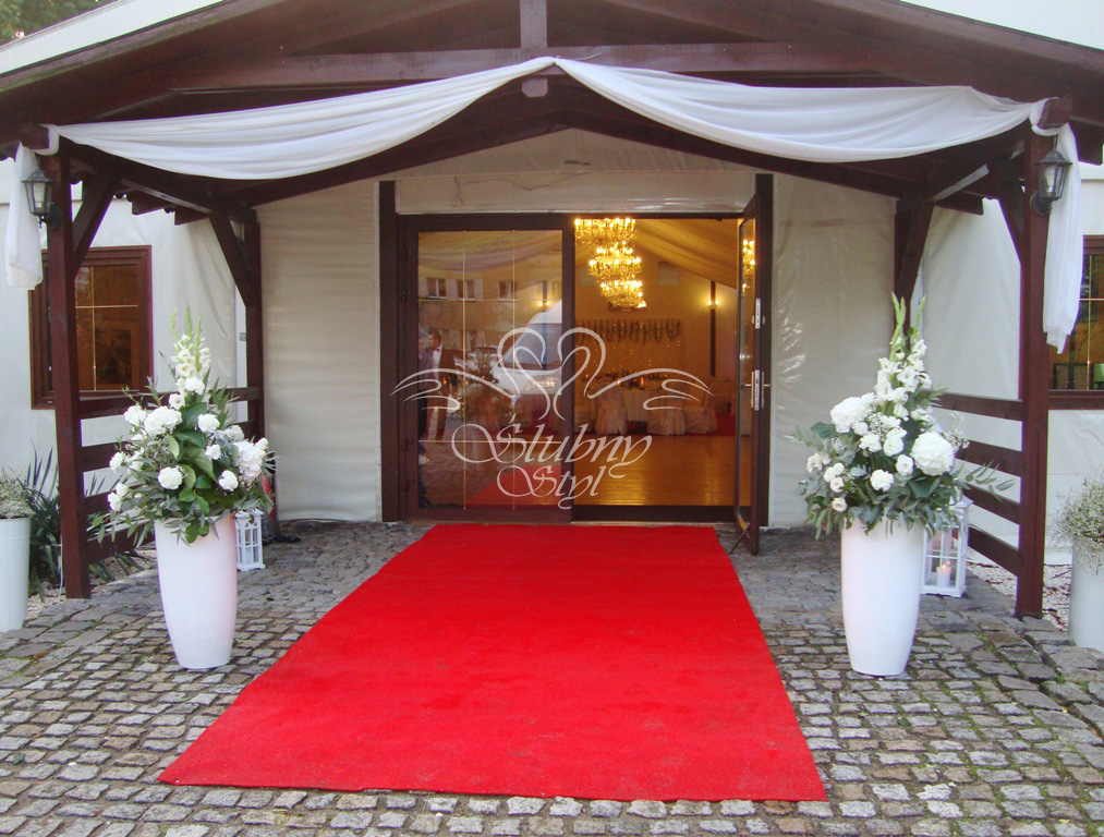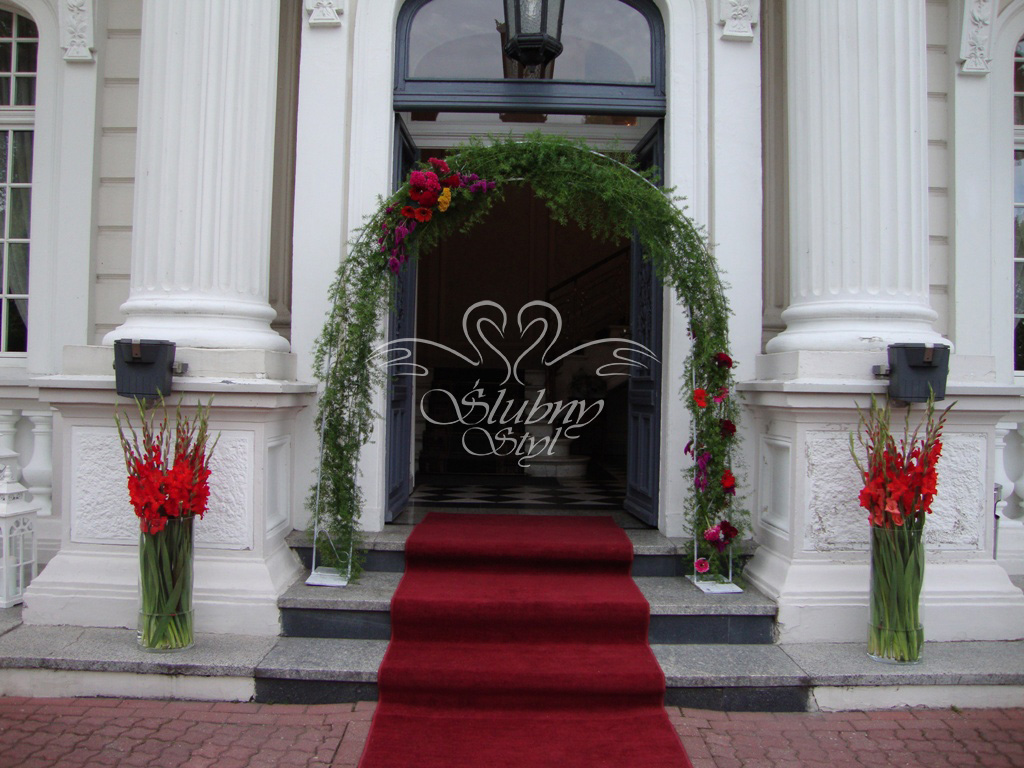 Czerwone gladiole, łuk kwiatowy w towarzystwie czerwonego dywanu na wejściu do budynku