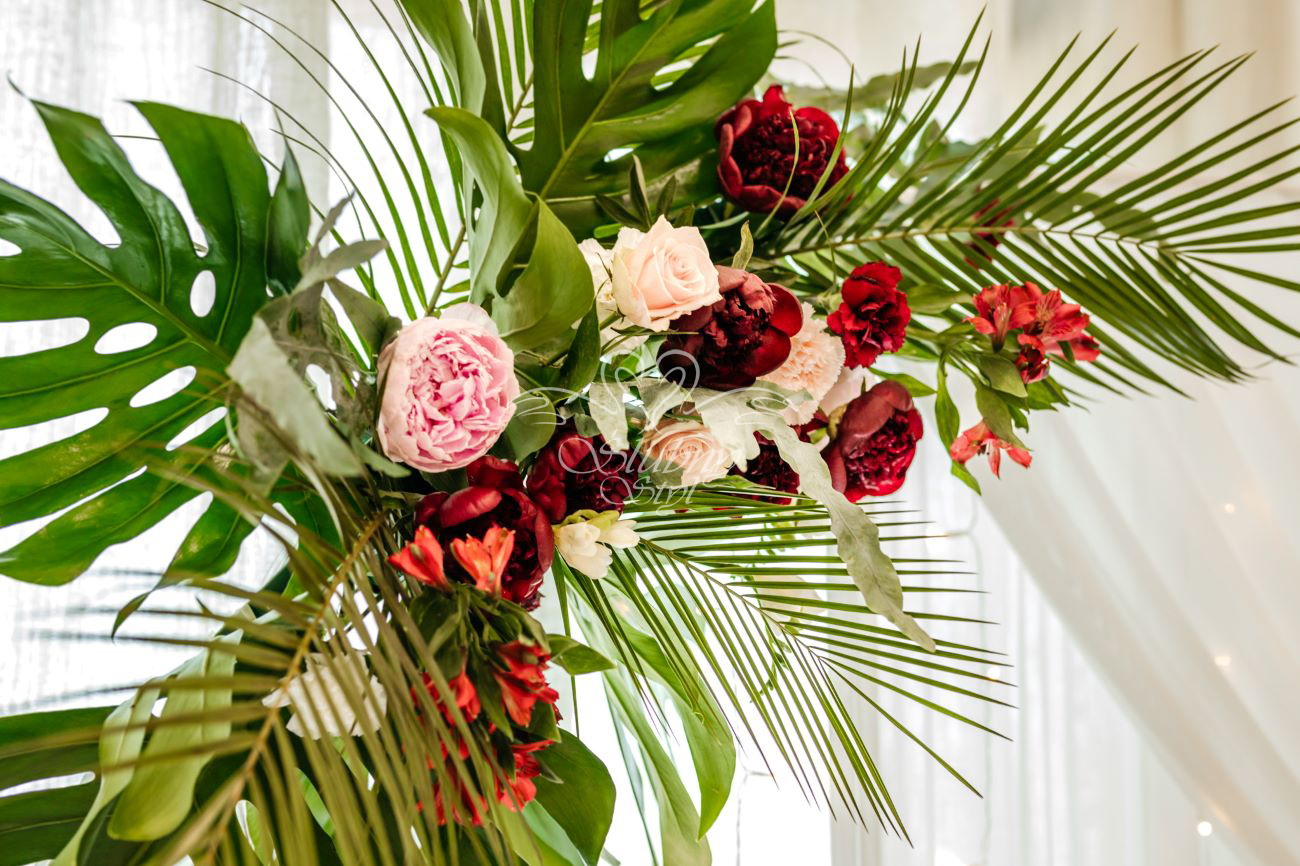 Dekoracja miejsca Młodej Pary w Pałacu Kasztanowym - liście monstery