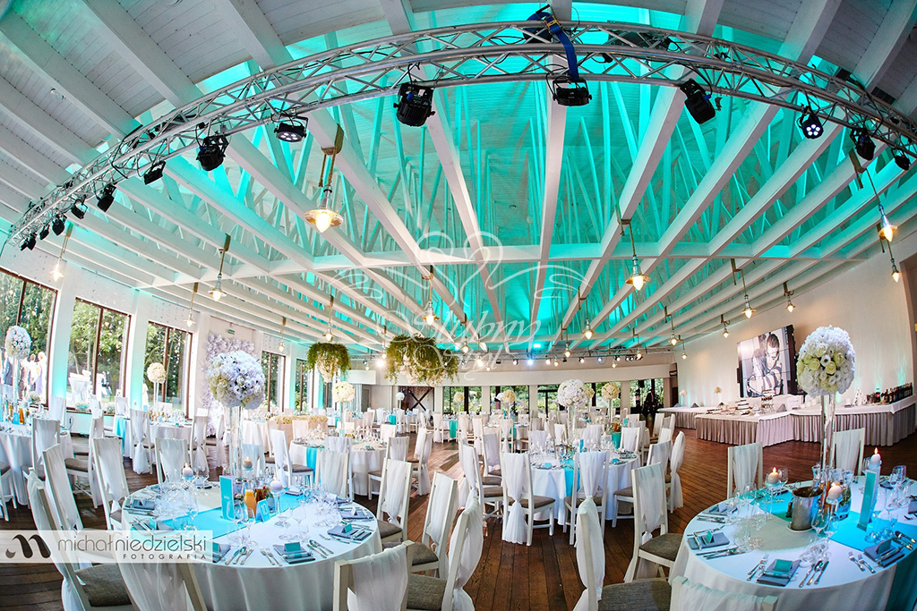 Biel, niebieski i złoto na weselu