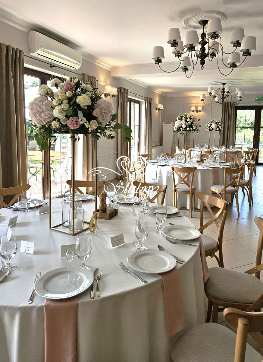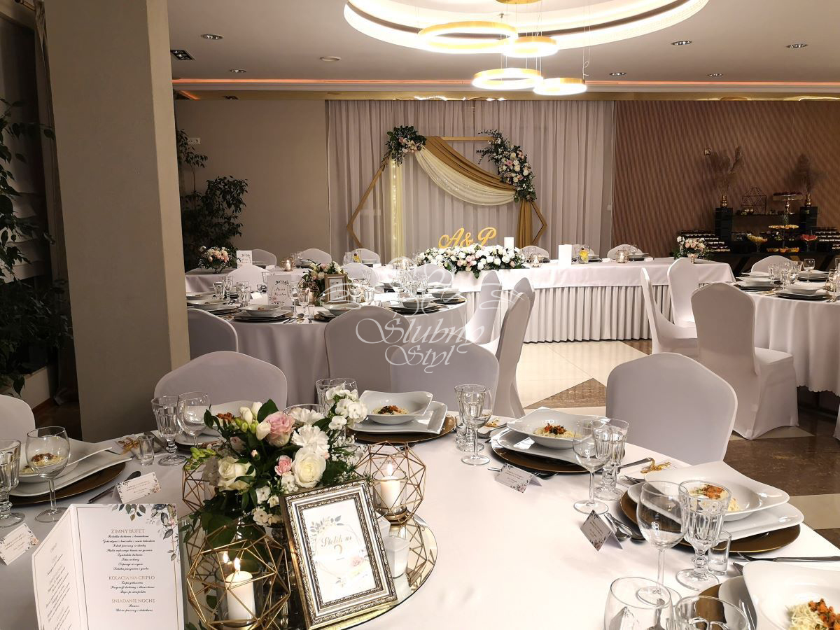 Dekoracje na wysokich złotych stojakach - Zajazd w Białej