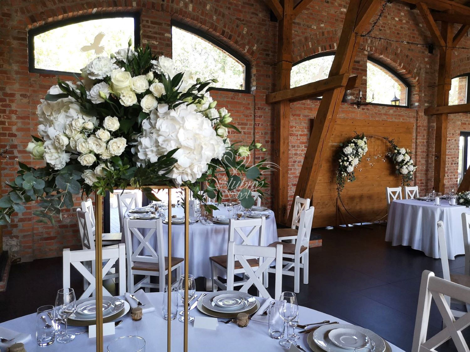 Delikatne dekoracje w ceglano-drewnianej stodole