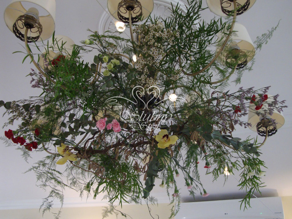 Dekoracja żyrandoli, bukiety kwiatów na parapetach