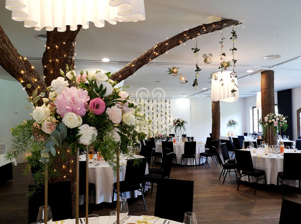 Kwiatowe drzewa w dekoracjach weselnych - Dwór Rybieniec