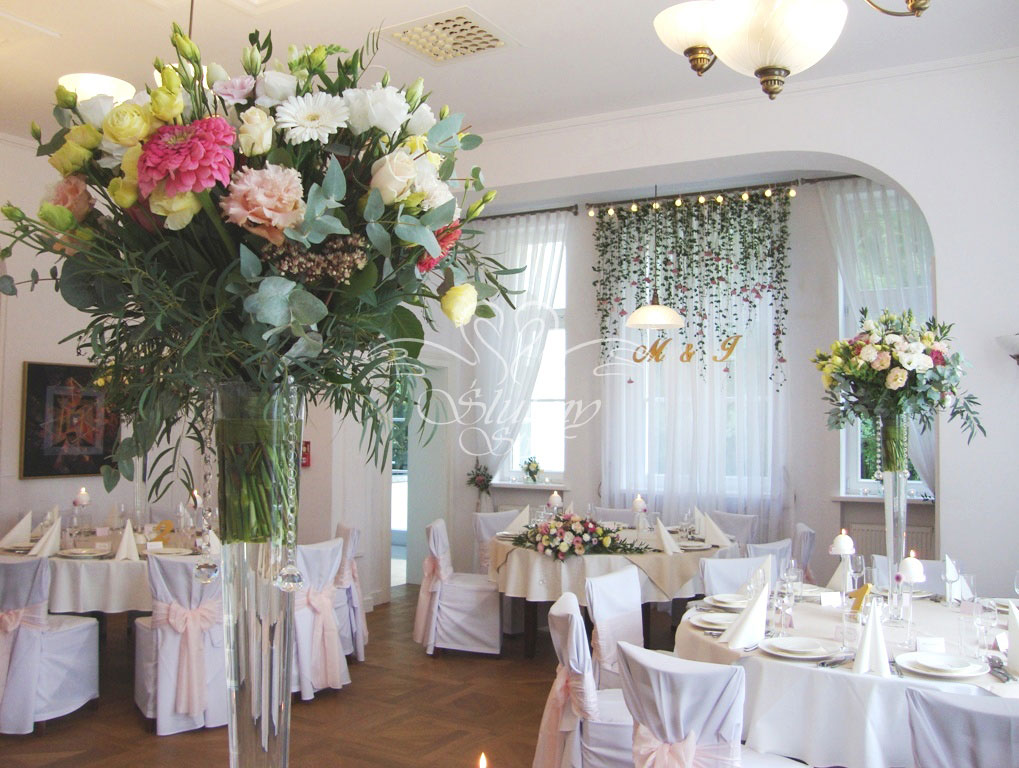 Wysokie bukiety kwiatowe na stołach