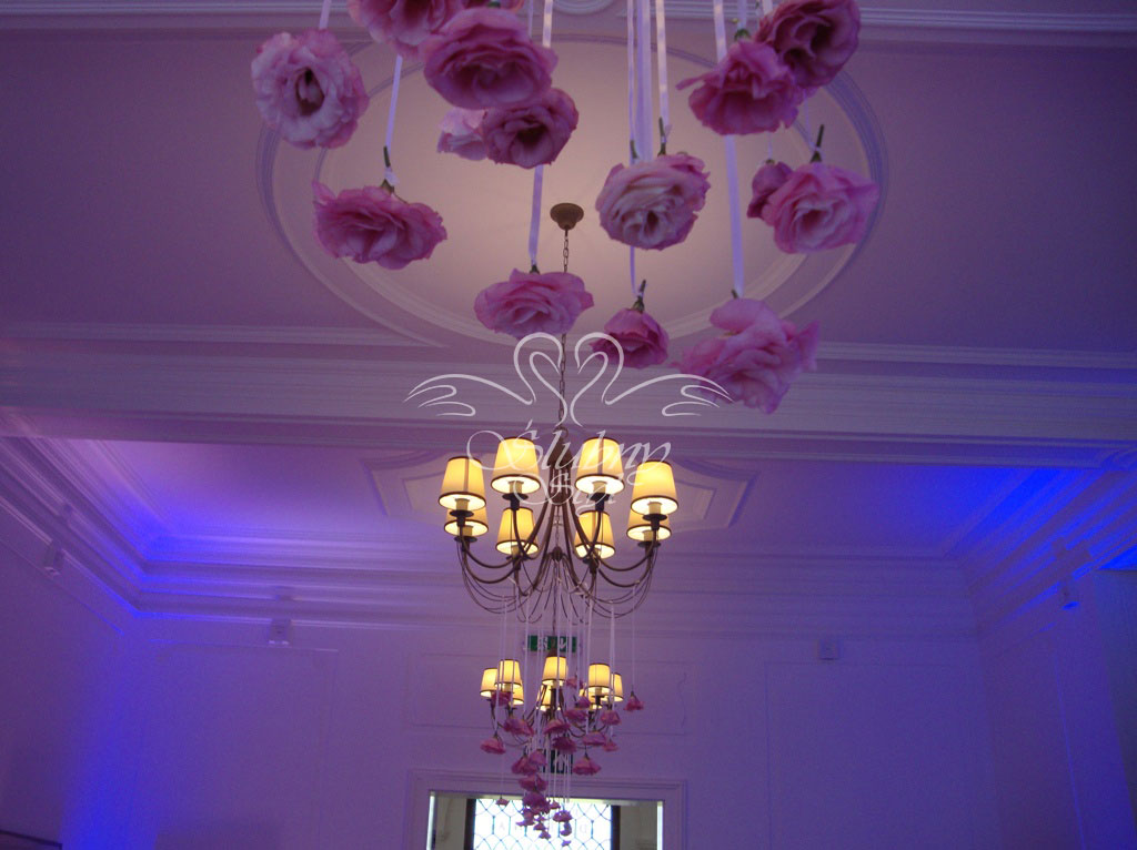 Główki różowej eustomy na wstążkach w dekoracji żyrandola