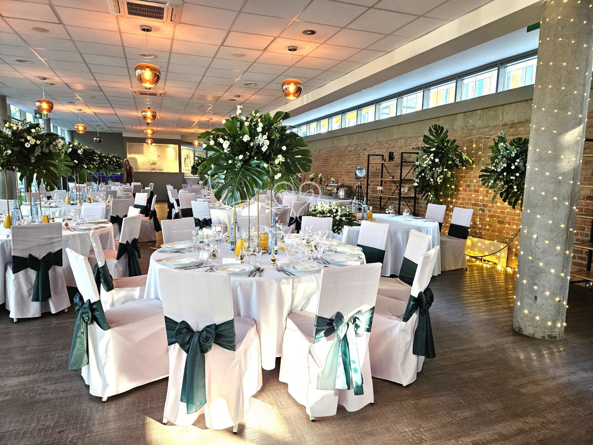 Wystrój sali weselnej z liśćmi monstery w Pałacu Kasztanowym