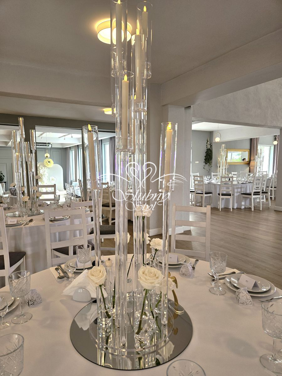 Eleganckie akrylowe świeczniki z dekoracją kwiatową na wesele