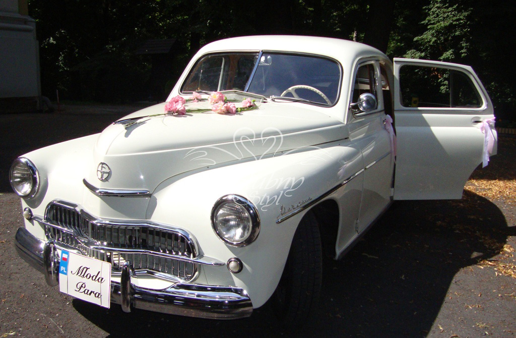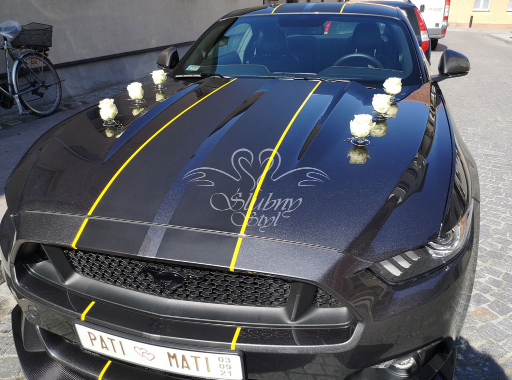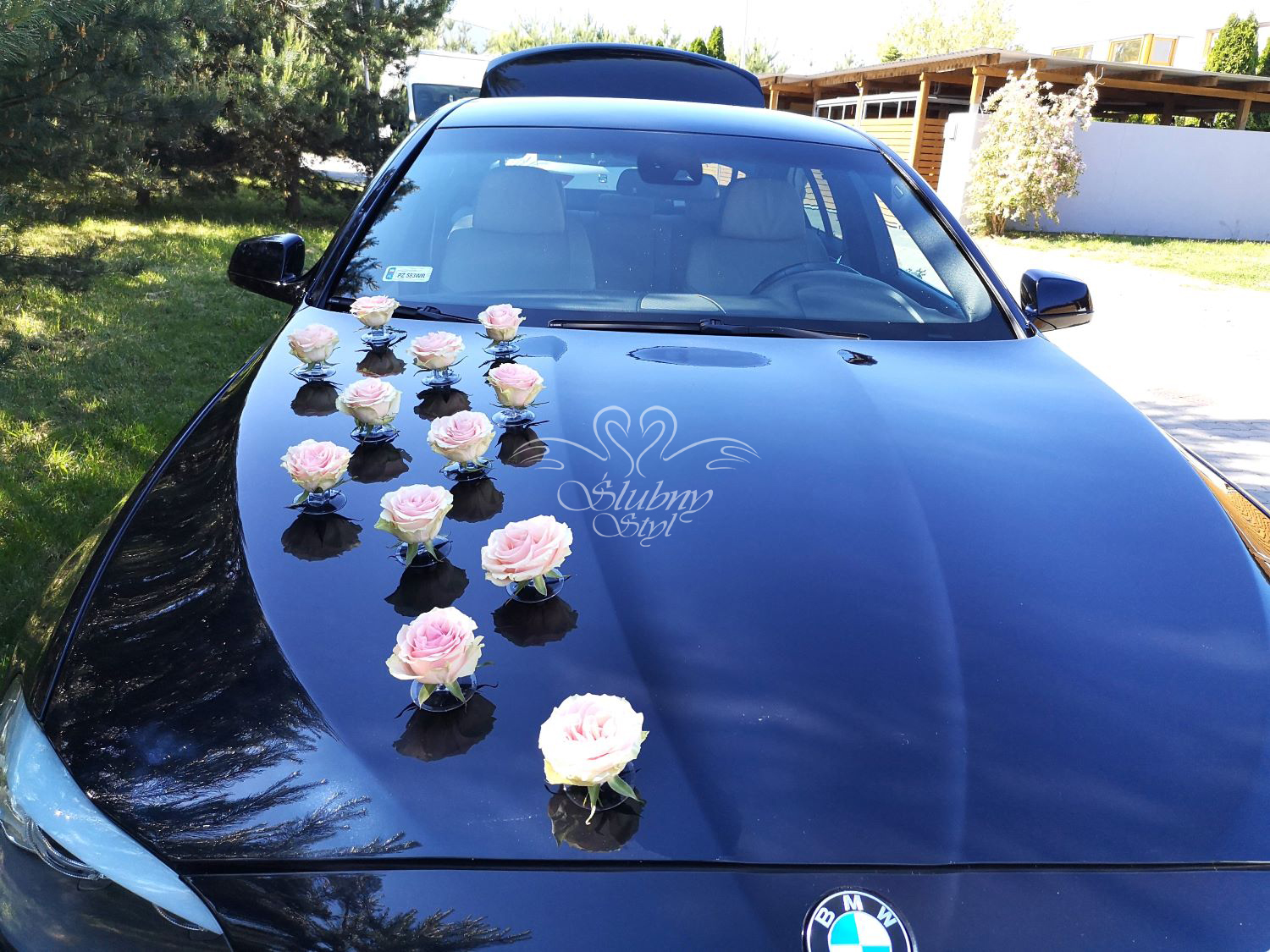 Eleganckie róże na masce samochodu - dekoracja na ślub