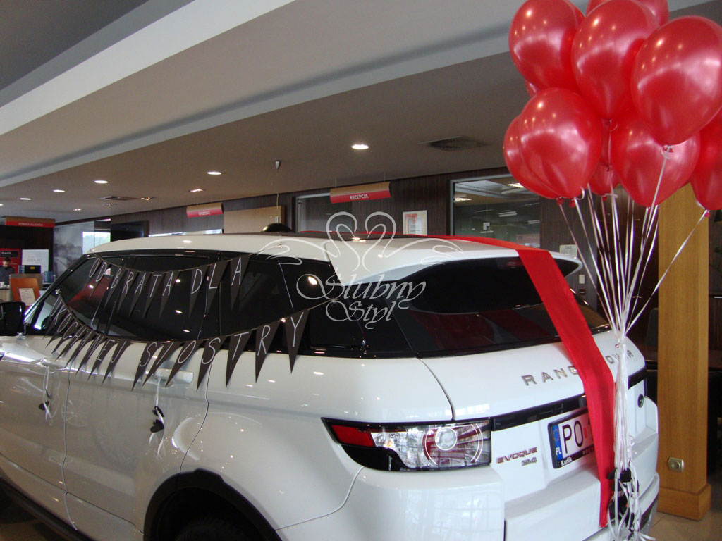 Dekoracje samochodu na prezent - balony i girlandy z proporczyków
