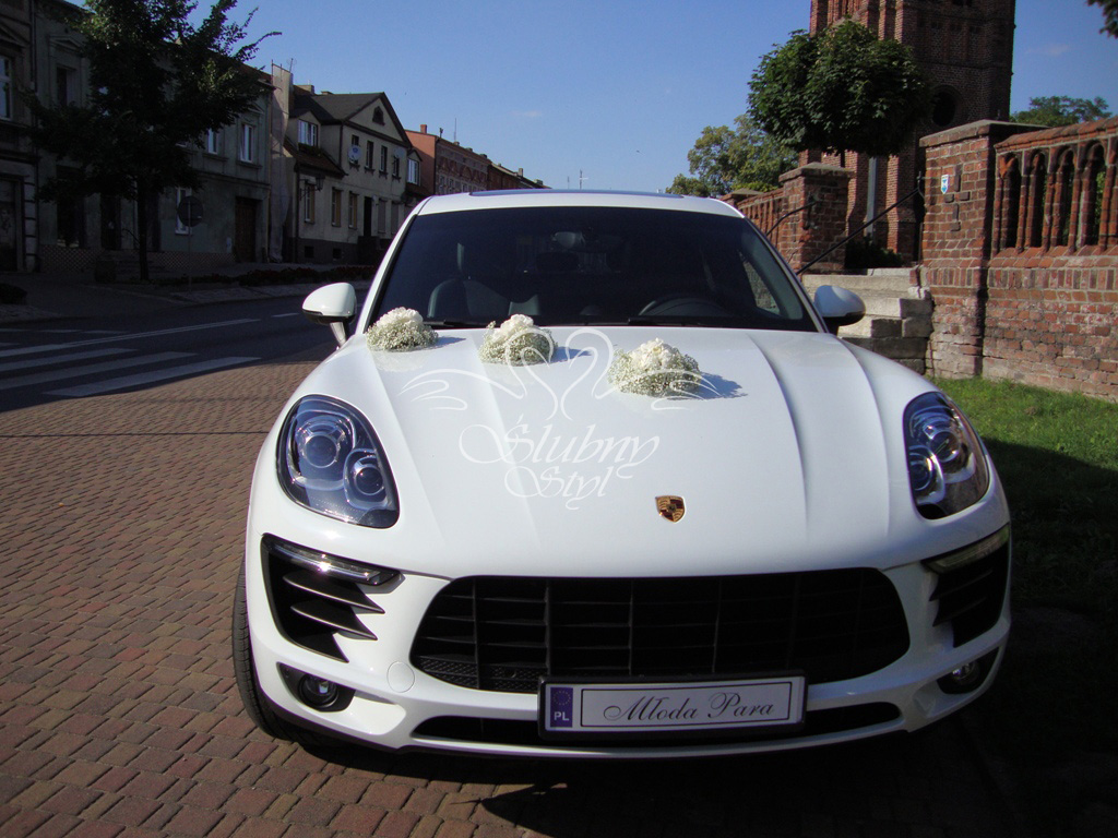 Wystrój samochodu na ślub - żywe kwiaty w połączeniu z gipsówką i zielonymi dodatkami