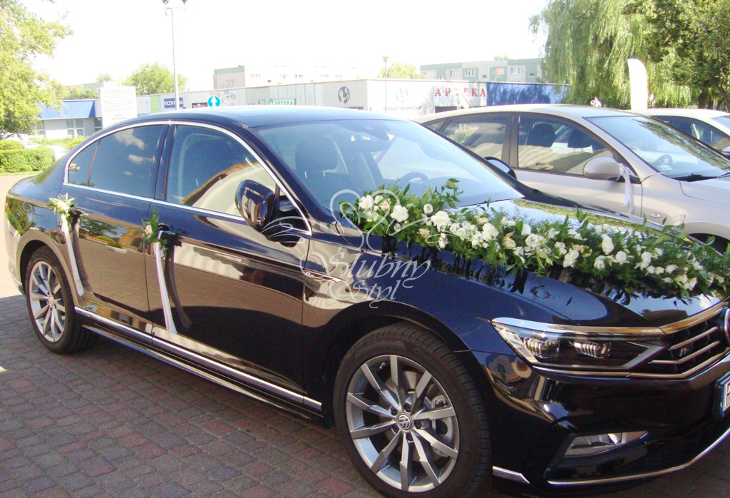 Dekoracje auta weselnego zieloną girlandą w połączeniu z gipsówką i białymi tulipanami