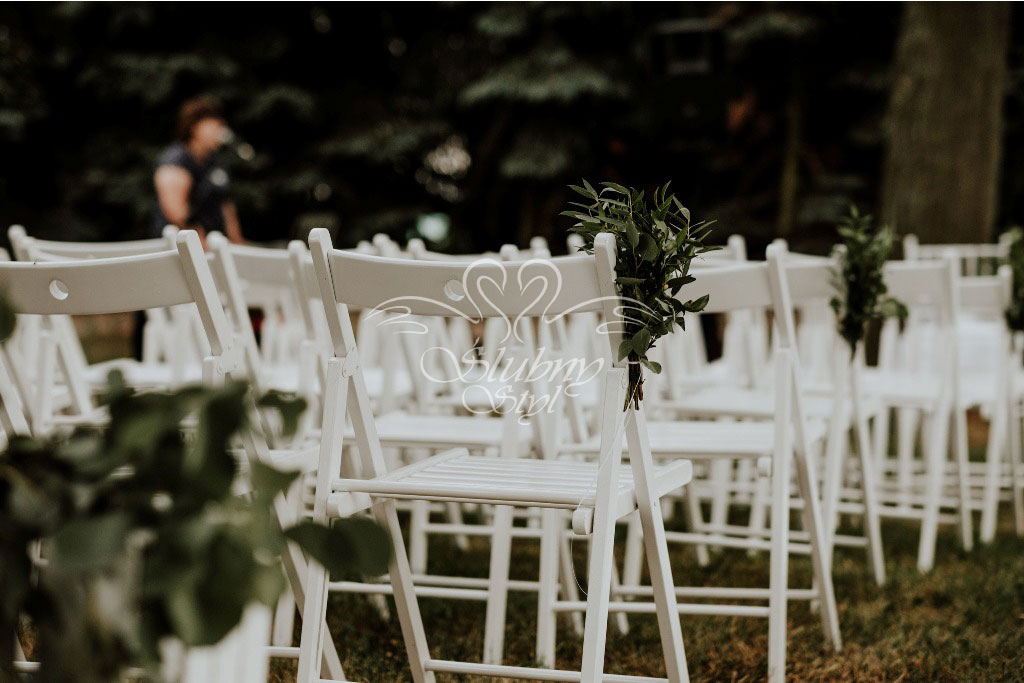 Ślub w plenerze dekoracja krzeseł girlandą z populusa